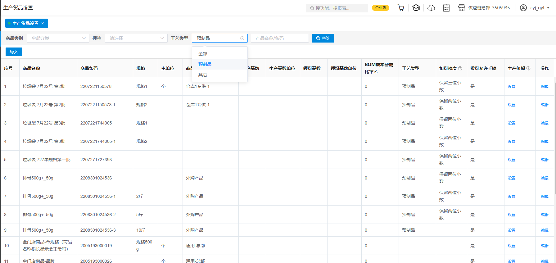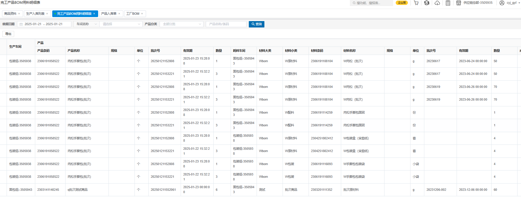 11. 完工产品BOM用料明细表支持批次、有效期显示(若商品投料多批次或进行多产出时,列表根据笛卡尔积显示)