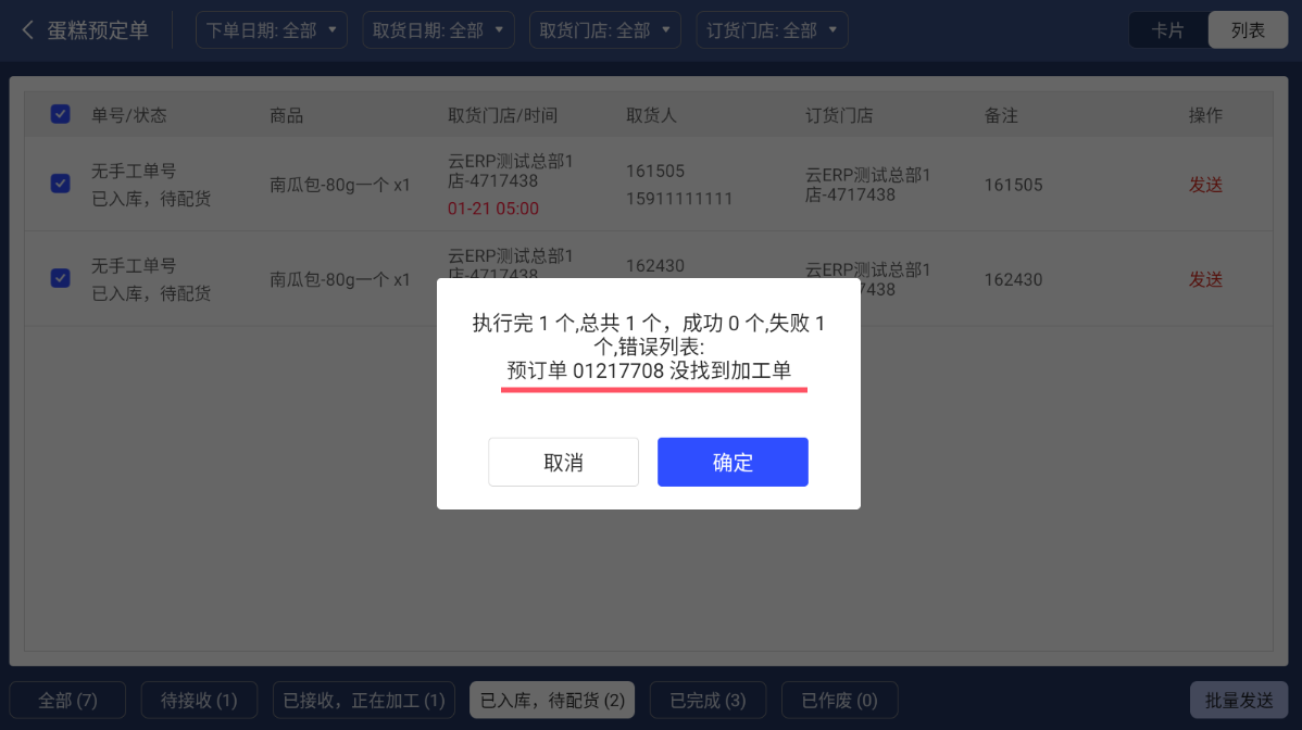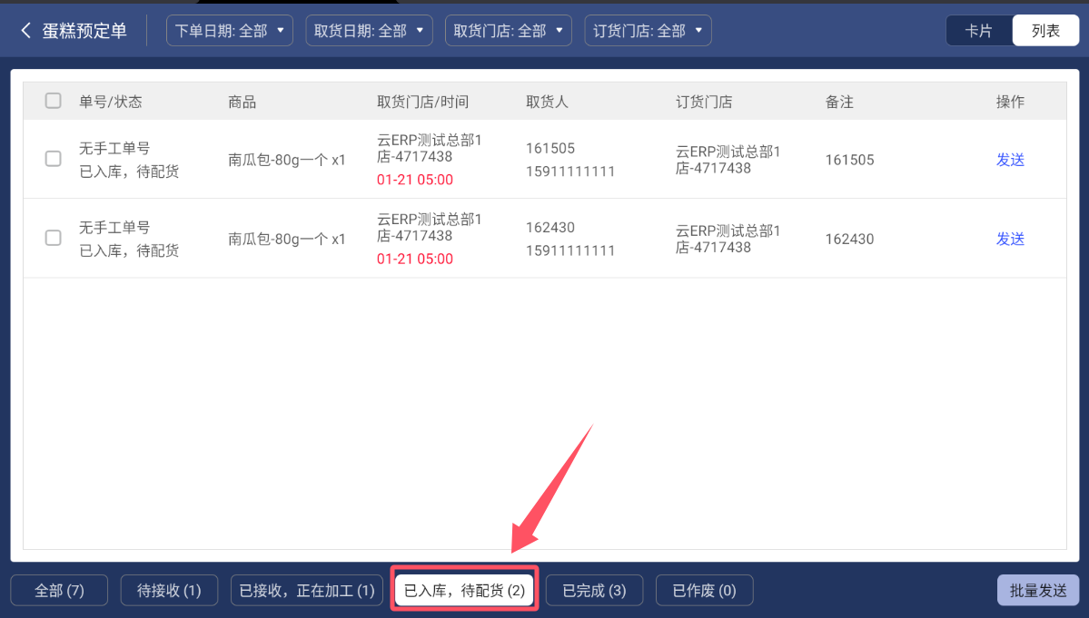 2. 蛋糕预订单模块【已完工,待配货】改成【已入库,待配货】,【批量发送】兼容参数【预订单、网单央厨模式下生产计划单审核后的流转模式】,工序模式无来源加工单时禁止发送,产品入库模式可直接发送